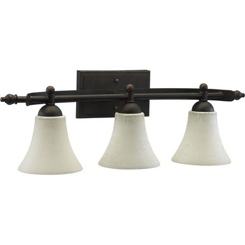 Requires 3 100w Medium Bulbs (Not Included)Bulb Included: No Bulb Type: Incandescent Certification: UL Collection: Aspen Energy Star Compliant: No Extension: 8-1 4″ Finish: Oiled Bronze Fixture Type: Vanity Height: 9-1 4 Light Direction: Down Lighting Number of Lights: 3 Shade: Linen Glass Socket 1 Base: Medium Socket 1 Max Wattage: 100 Style: Transitional Suggested Room Fit: Bathroom UL Listed: Damp Location Usage: Interior Damp Voltage: 110 – 120 Wattage: 100 Width: 27-1 4