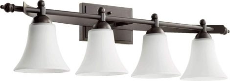Features: Bell shaped glass shades to soften and diffuse the light Requires (4) 100 watt medium (E26) bulbs Not Included Listed for damp location Product Dimensions: Height: 9″ Width: 36″ (measured from furthest point left to furthest point right on fixture) Extension: 8.25″ (measured from mounting surface to furthest protruding point on fixture) Product Weight: 13.6 lbs Product Weight: 13.6 lbs Electrical Specifications: Number of Bulbs: 4 Bulb Included: No Bulb Base: Medium (E26) Watts Per Bulb: 100 Wattage: 400 Voltage: 120v For 30 years Quorum International has been producing innovative and stylish home lighting. Headquartered in Fort Worth, Texas, the Quorum International team emphasizes high-quality craftsmanship backed by the best customer service in the industry.