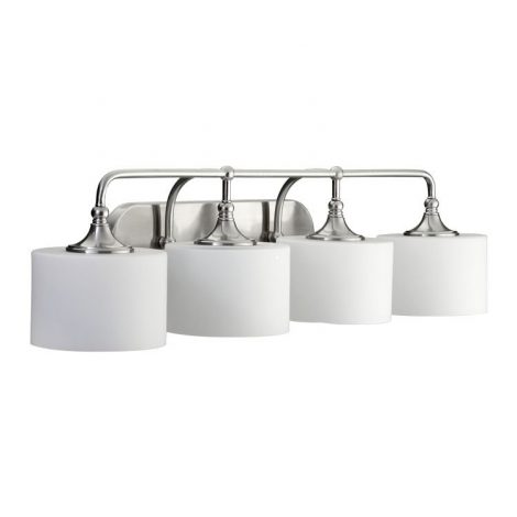 Transitional 4 Light Down Lighting Vanity Fixture from the Rockwood Collection Is your vanity area missing something? Why not add some transitional style to your home with this funky classic four light vanity fixture from the Rockwood Collection? Featuring four 100 watt bulbs encased in gorgeous Satin Opal glass shades, this fixture is the perfect combination of classic support and contemporary glass, making it fit with most any decor. Features: UL listed for Damp Locations Diffuser Material: Glass Shade Color: Satin Opal Specifications: Height: 9.25″ Width: 35.5″ Extension: 9″ Utilizes (4) 100w medium base bulbs (Not Included) Wattage: 400