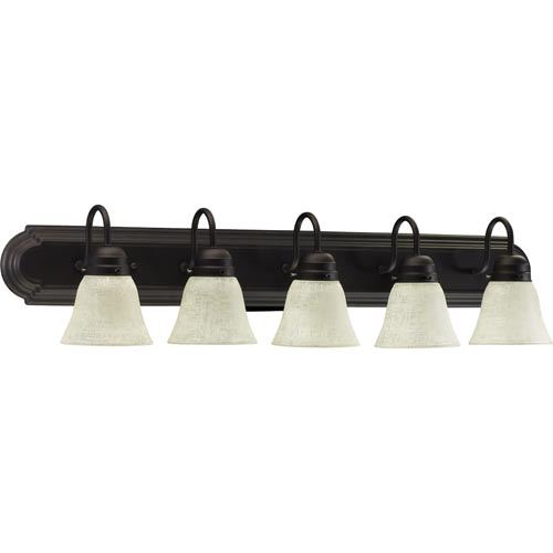 Linen Glass Requires 5 100w Medium Bulbs (Not Included) UL listed for Damp locationsBlades Included: None Bulb Type: Incandescent Category Group: Bathroom Fixtures Category Sub Group: Vanity Lights Depth: 7.75 Extension: 7-3 4 Finish: Oiled Bronze Height: 8.00 Light Direction: Down Lighting Number of Lights: 5 Shade Material: Glass Socket 1 Base: Medium Socket 1 Max Wattage: 100 Socket1 Max Wattage: 100 Socket1 Number Of Bulbs: 5 Style: Transitional Suggested Room Fit: Bathroom, Dressing Room Wattage: 100 Weight: 11.60 Width: 36.00