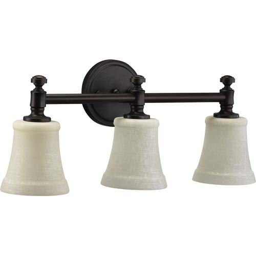 Linen Glass Requires 3 100w Medium Bulbs (Not Included) UL listed for Damp locationsBulb Type: Incandescent Extension: 6 Finish: Oiled Bronze Height: 9 Light Direction: Down Lighting Number of Lights: 3 Shade Material: Glass Socket 1 Base: Medium Socket 1 Max Wattage: 100 Style: Transitional Suggested Room Fit: Bathroom, Dressing Room Wattage: 100 Weight: 6.5 Width: 21-1 2
