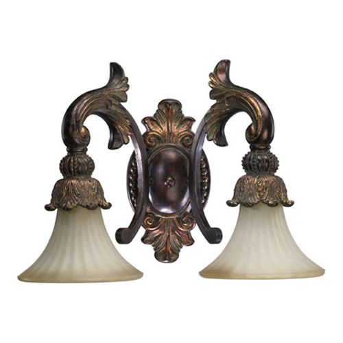 Antique Amber Scavo Glass Requires 2 100w Medium Bulbs (Not Included) UL listed for Damp locationsBulb Type: Incandescent Category Group: Bathroom Fixtures Category Sub Group: Vanity Lights Collection: Madeleine Depth: 10.50 Extension: 10-1 2 Finish: Corsican Gold Height: 13.00 Light Direction: Down Lighting Number of Lights: 2 Socket 1 Base: Medium Socket 1 Max Wattage: 100 Socket1 Max Wattage: 100 Socket1 Number Of Bulbs: 2 Style: Traditional Suggested Room Fit: Bathroom Wattage: 100 Weight: 9.80 Width: 18.50