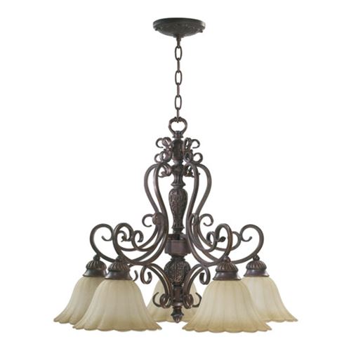 (5) 100W MediumBulb Type: Incandescent Collection: Coronado Finish: Gilded Bronze Height: 21-1 2 Light Direction: Down Lighting Number of Lights: 5 Number of Tiers: 1 Shade: Etruscan with Amber Accen Glass Socket 1 Base: Medium Socket 1 Max Wattage: 100 Style: Renaissance Suggested Room Fit: Kitchen Nook Type: Non Crystal Chandeliers Usage: Interior Voltage: 110 – 120 Watts Per Bulb: 100 Width: 25-1 2
