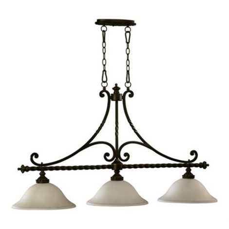 Crafted in the tradition of Old-World European design, the Alameda family recalls the romance of centuries-old architectural detailing. Scrolling, rope-wound arms add a touch of femininity to the rustic creation, and soft, ethereal light radiates from the waxy pillar candle-style light source. The oiled bronze ironwork contrasts with the ivory hue of the pillar candles to create rich depth and a warm sensory experience.Requires 3 100W medium base bulbs (Not Included) Includes 8′ Chain Includes 10′ Lead WireBulb Type: Incandescent Category Group: Island Pool Table Category Sub Group: Island Lights Collection: Alameda Finish: Oiled Bronze Height: 26.00 Length: 46.00 Light Direction: Down Lighting Number of Lights: 3 Shade: Amber Scavo Glass Socket 1 Base: Medium Socket 1 Max Wattage: 100 Socket1 Max Wattage: 100 Socket1 Number Of Bulbs: 3 Style: Transitional Suggested Room Fit: Game Room, Kitchen Type: Island Lights Usage: Interior Voltage: 110 – 120 Watts Per Bulb: 100 Weight: 23.80 Width: 13.00